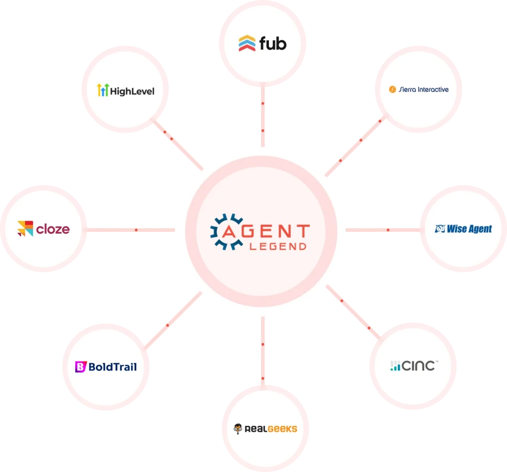 Agent Legend integrates with 500+ CRMs and lead sources (including Follow Up Boss, BoldTrail, kvCORE, and Salesforce) via direct API or CSV upload